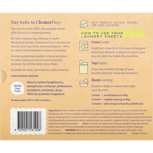 Cleaner Days Laundry Detergent Sheets Lemon + Eucalyptus 60pcs - Cleaner Days