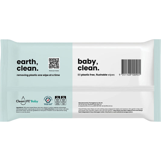 CleanLIFE Flushable Plastic Free Wipes Baby Clean 80pk