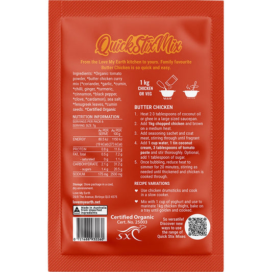 Love My Earth Quick Stix Mix Organic Recipe Base Butter Chicken 10x45g - Love My Earth