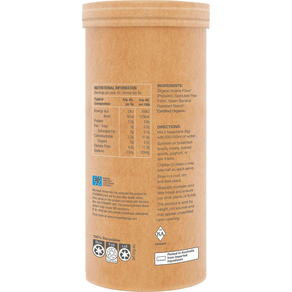 Organic Acacia Fibre (Prebiotic)*, Sprouted Pea Fibre*, Green Banana Resistant Starch* *Certified Organic