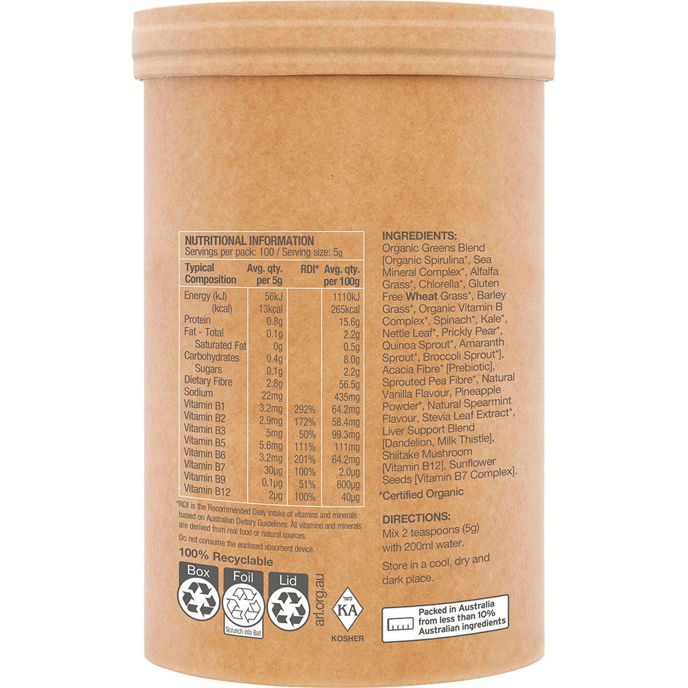 Organic Greens Blend [Organic Spirulina*, Sea Mineral Complex*, Alfalfa Grass*, Chlorella*, Gluten Free Wheat Grass*, Barley Grass*, Organic Real Food Vitamin B Complex*, Spinach*, Kale*, Nettle Leaf*, Prickly Pear*, Quinoa Sprout*, Amaranth Sprout*, Broccoli Sprout*], Acacia Fibre* [Prebiotic], Sprouted Pea Fibre*, Natural Vanilla Flavour, Pineapple Powder*, Natural Spearmint Flavour, Stevia Leaf Extract*, Liver Support Blend [Dandelion, Milk Thistle], Shiitake Mushroom [Vitamin B12], Sunflower Seeds [Vitamin B7 Complex]. *Certified Organic