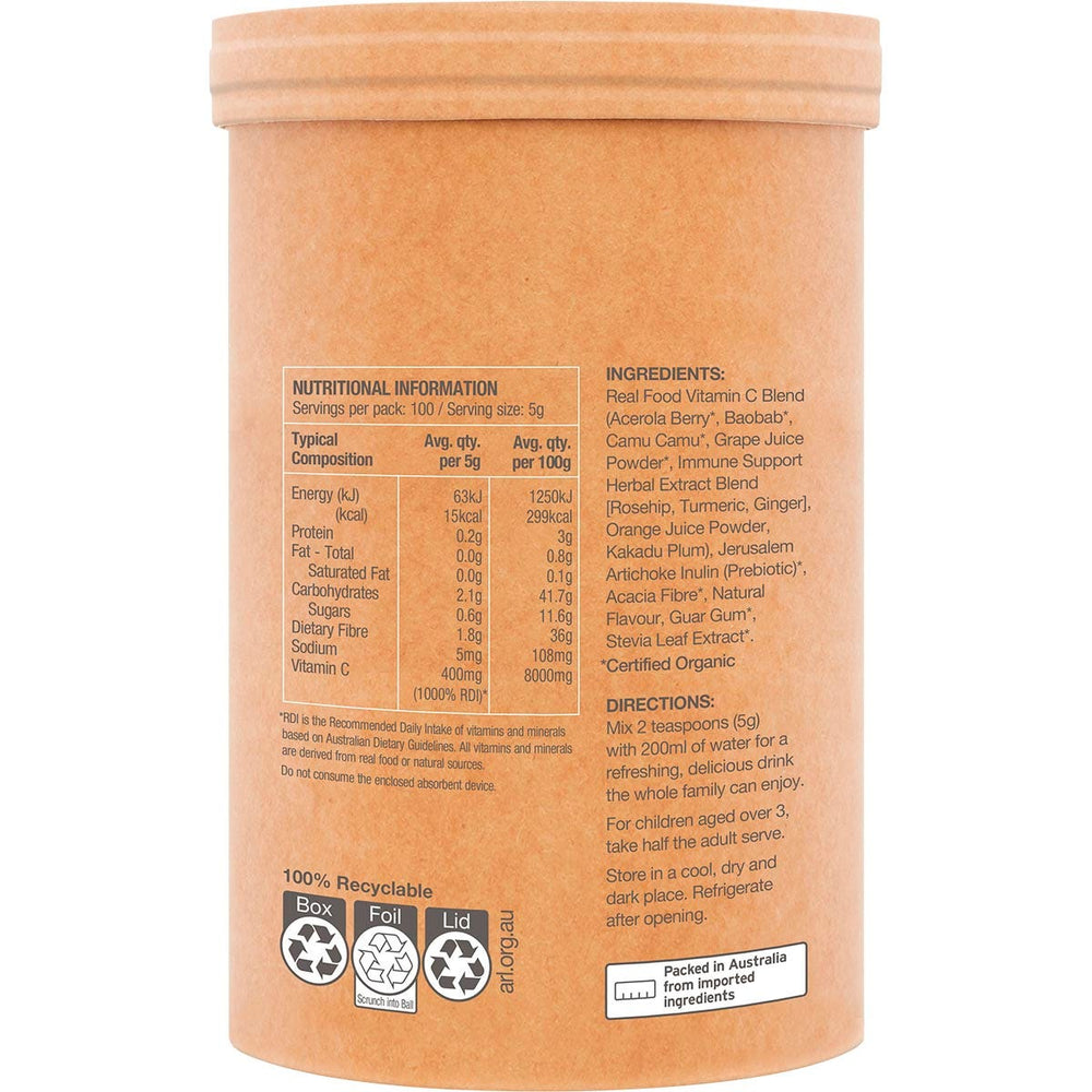 Real Food Vitamin C Blend (Acerola Berry*, Baobab*, Camu Camu*, Grape Juice Powder*, Immune Support Herbal Extract Blend [Rosehip, Turmeric, Ginger], Orange Juice Powder, Kakadu Plum), Jerusalem Artichoke Inulin (Prebiotic)*, Acacia Fibre*, Natural Flavour, Guar Gum*, Stevia Leaf Extract*. *Certified Organic