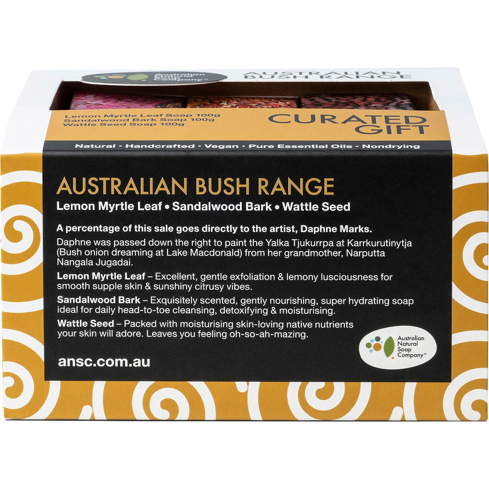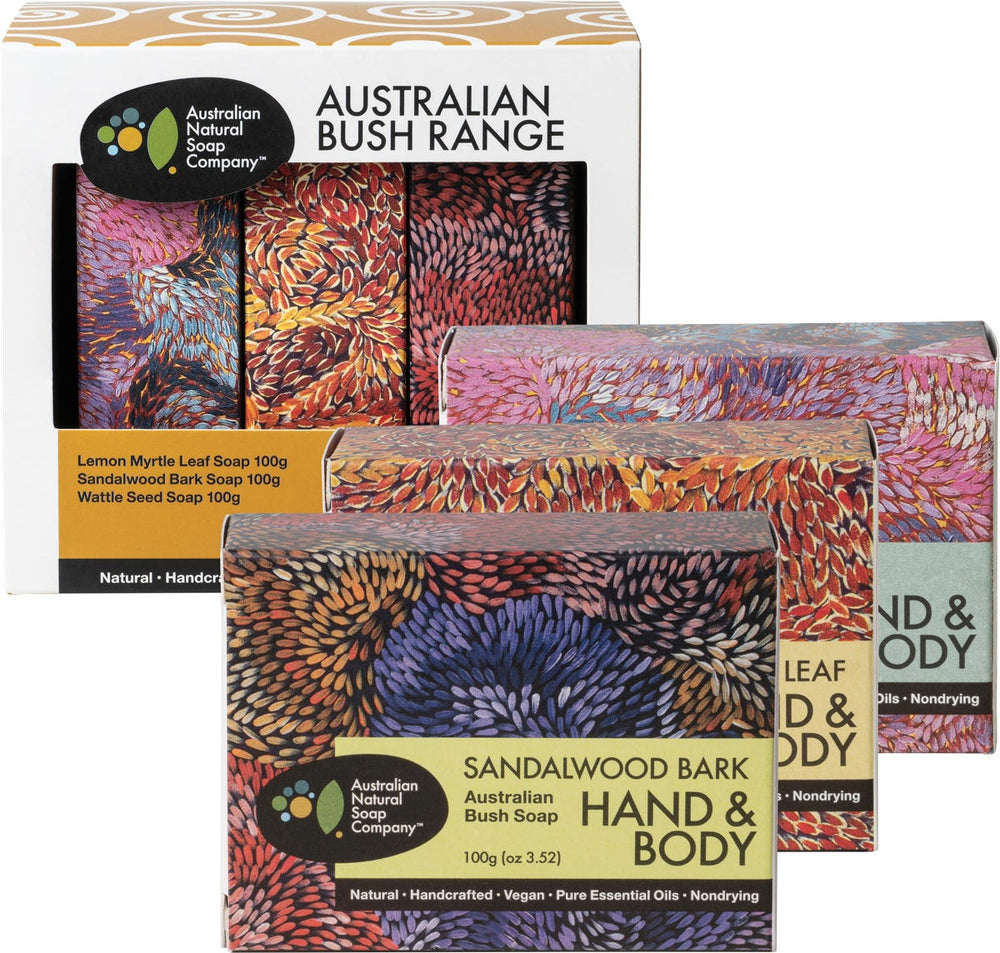 Australian Natural Soap Co Curated Gift Australian Bush Range 3pk Ingredients: Lemon Myrtle Leaf Soap 100g (Sodium Olivate (Olive Oil), Backhousia Citriodora (Lemon Myrtle) Leaf Powder, Eucalyptus Staigeriana (Lemon Ironbark) Leaf Oil, Kunzea Ambigua Leaf Oil), Sandalwood Bark Soap 100g (Sodium Olivate, Fusanas Spicatum (Australian Sandalwood) Wood Powder, Cymbopogon Martini (Palmarosa) Oil, Callitris Columellaris (White Cypress) Leaf Oil), Wattle Seed Soap 100g (Sodium Olivate (Olive Oil), Acacia Victoriae (Wattleseed) Seed Powder, Melaleuca Quinquenervia (Nerolina) Leaf Oil, Melaleuca Ericifolia (Rosalina) Leaf Oil). This product is usually dispatched or made available for collection in 2-3 business days