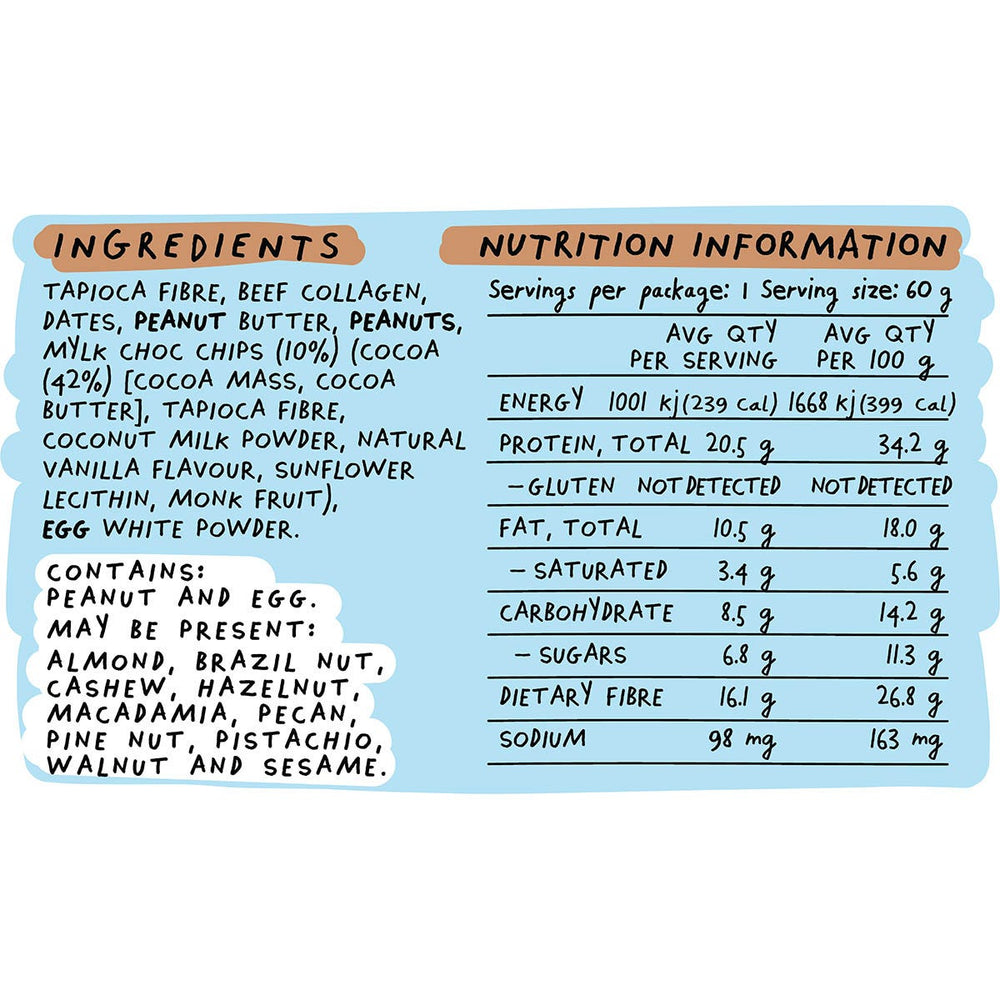 Peanut Butter (Peanuts, Salt) (24%), Beef Collagen, Maple Syrup, Dehydrated Free Range Egg White, Dates, MCT Oil, Organic Mylk Chocolate (Cacao [Virgin Cacao Butter, Raw Cacao Beans], Evaporated Coconut Nectar, Coconut, Cashew Nuts, Hazelnuts, Almonds) (10%)