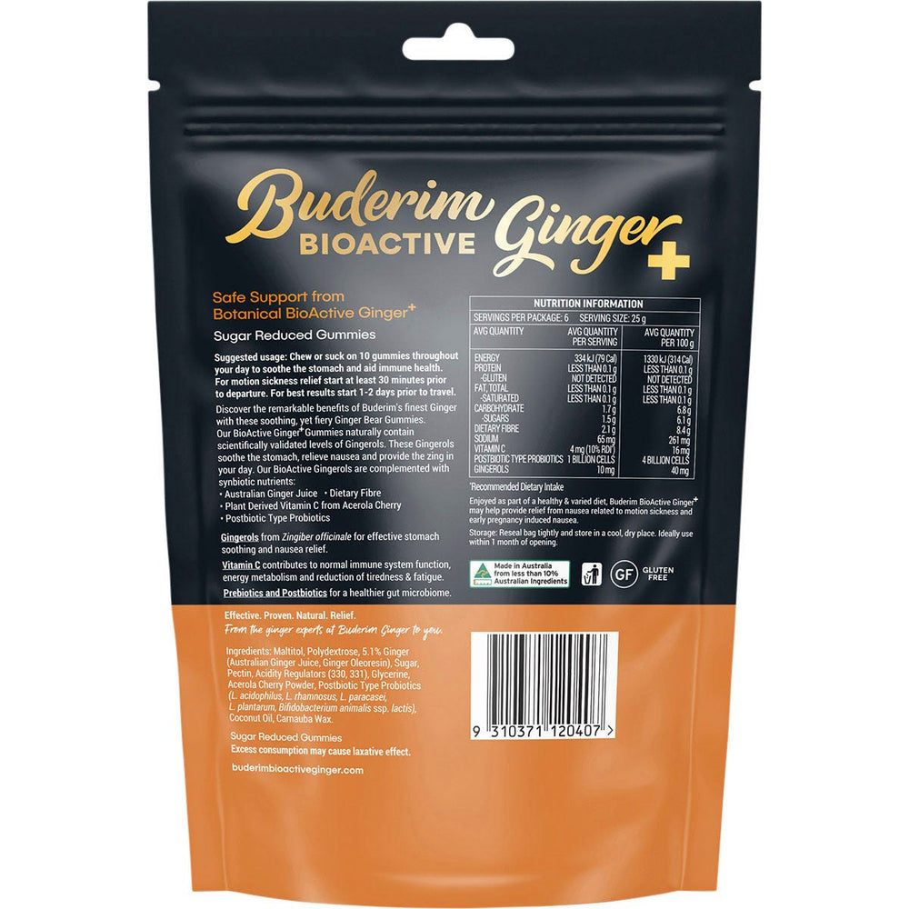 Maltitol, Polydextrose, Ginger 5.1% (Australian Ginger Juice, Ginger Oleoresin), Australian Sugar, Pectin, Acidity Regulators (330, 331), Glycerine, Acerola Cherry Powder (Vitamin C), Postbiotic Type Probiotics (L. Acidophilus, L. Plantarum), Coconut Oil, Carnauba Wax.