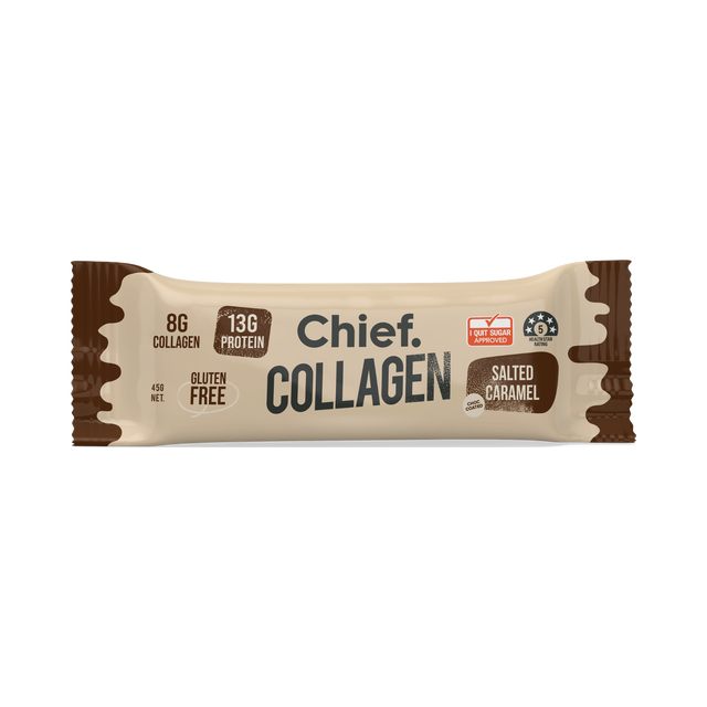 Take your taste buds on a wild ride, the ultimate fusion of indulgence and nutrition, with our chocolate covered Collagen Protein Bars. Beneath the heavenly dark chocolate lies a delectable core of biscuity, chocolatey Cashew Butter with a delicious caramel flavour. But this bar is more than just an enticing delight for your taste buds. It's still a powerhouse of protein, healthy fats and fibre, meticulously crafted to fuel your #ChiefLife and vanquish hunger.