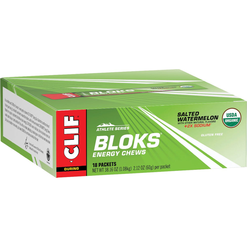 Ingredients: Tapioca Syrup*, Cane Sugar*, Maltodextrin*, Pectin, Citric Acid, Watermelon Extract With Other Natural Flavours, Salt, Potassium Citrate, Colour (Black Carrot Juice Concentrate)*, Sunflower Oil*, Carnauba Wax*. *Organic Ingredient †Contains 2 Times The Sodium Of Other Clif Bloks Flavours