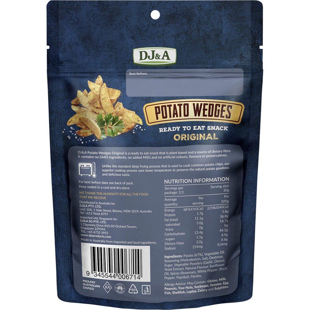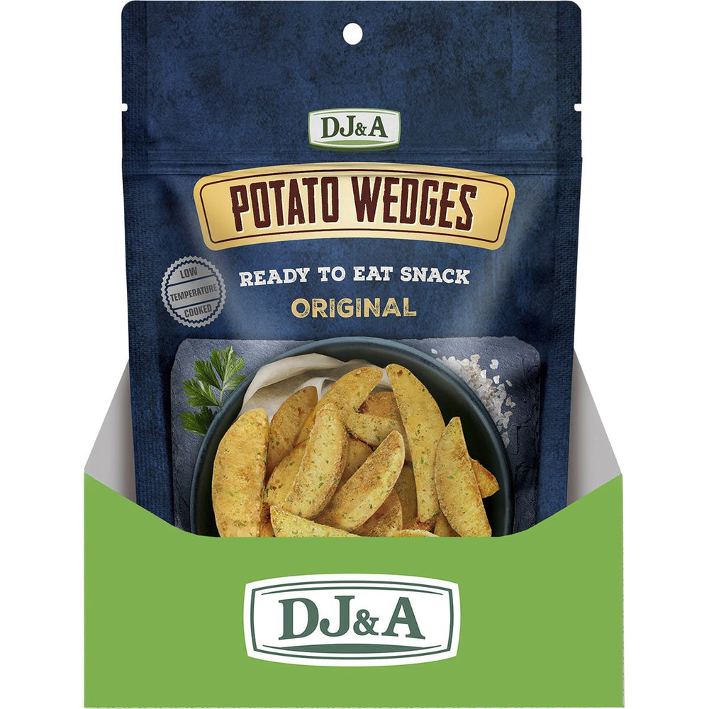 DJ&A Potato Wedges Original 9x100g Ingredients: Potato (67%), Vegetable Oil, Seasoning (Maltodextrin, Salt, Dextrose, Sugar, Vegetable Powders (Garlic, Onion), Yeast Extract, Natural Flavour, Sunflower Oil, Spices (Rosemary, White Pepper, Black This product is usually dispatched or made available for collection in 2-3 business days