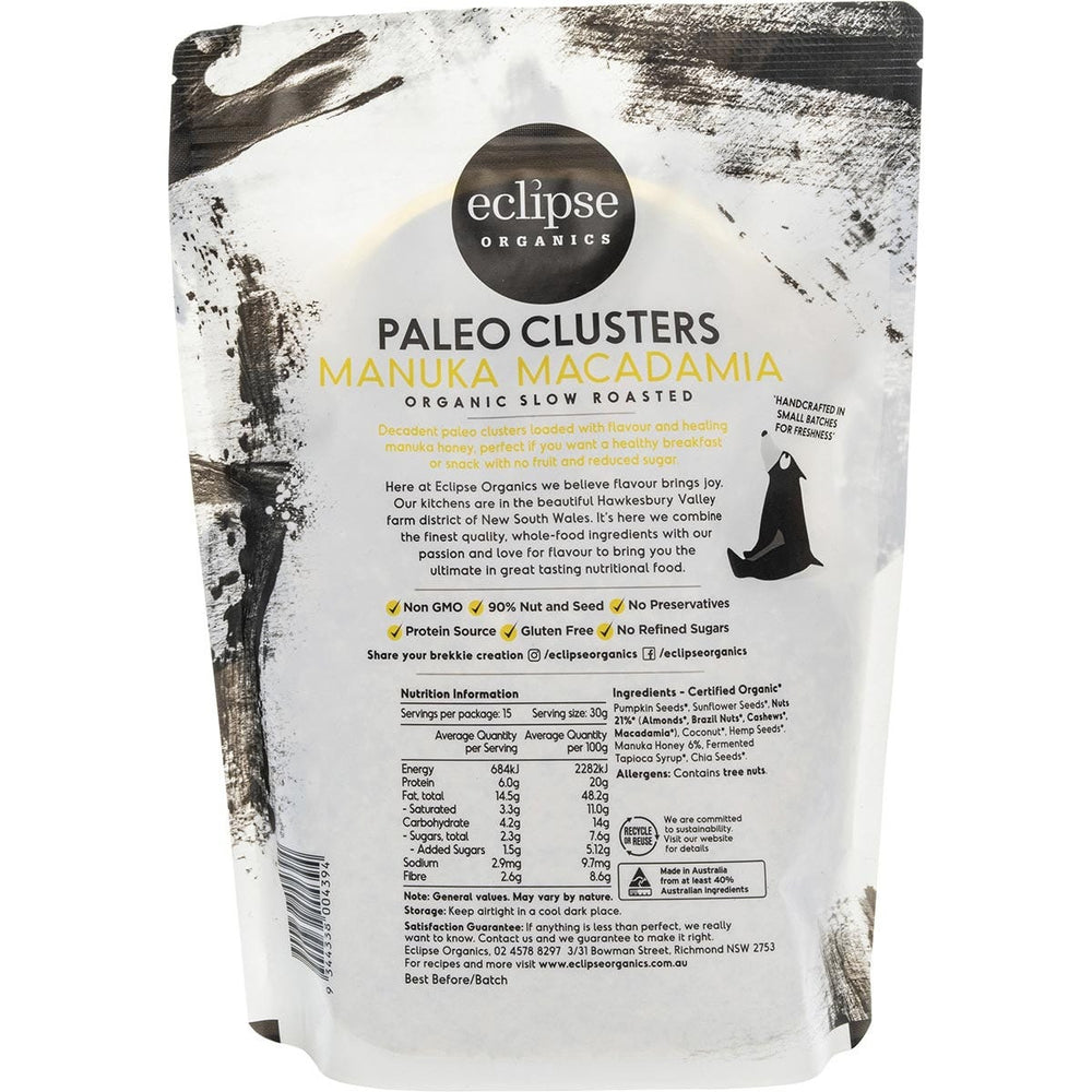 Paleo bites crafted from macadamias, almonds, brazil nuts, cashews and seeds slowly roasted into crunchy clusters with coconut and premium Australian Manuka honey. Decadant paleo clusters loaded with flavour and healing manuka honey, perfect if you want a healthy breakfast or snack.