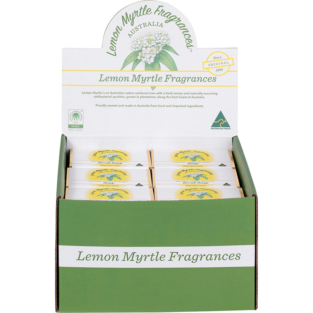 Lemon Myrtle Fragrances Soap Mixed Plain & Exfoliant 24x100g Ingredients: Smooth: Sodium Palmate, Sodium Palm Kernalate (Palm Oil – RSPO MB 1106206), Purified Water, Glycerin, Backhousia Citriodora (Lemon Myrtle) Oil, Macadamia Integrifolia Seed Oil, Palm Kernel Acid, Palm Acid, Sodium Chloride, Tetrasodium EDTA, Tetrasodium Etidronate. Scrub: Sodium Palmate, Sodium Palm Kernalate (Palm Oil – RSPO MB 1106206), Purified Water, Glycerin, Backhousia Citriodora (Lemon Myrtle) Oil, Macadamia Integrifolia Seed Oil, Palm Kernal Acid, Palm Acid, Backhousia Citriodora (Lemon Myrtle) Leaf, Sodium Chloride, Tetrasodium EDTA, Tetrasodium Etidronate. This product is usually dispatched or made available for collection in 2-3 business days