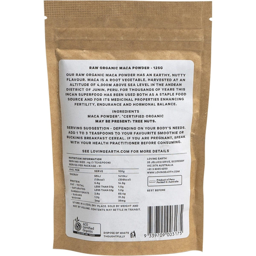 Loving Earth Maca Powder 125g Ingredients: Maca Powder*. *Certified Organic This product is usually dispatched or made available for collection in 2-3 business days