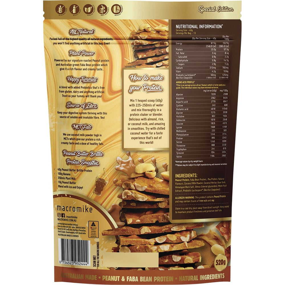MACRO MIKE Peanut Plant Protein Peanut Butter Brittle 520g Ingredients: Peanut Protein, Faba Bean Protein, Pea Protein, Natural Flavours, Coconut Milk Powder, Coconut Nectar, Guar Gum, Himalayan Rock Salt, Stevia (Steviol Glycosides), Monk Fruit Extract, Probiotic Lactospore (Bacillus Coagulans). This product is usually dispatched or made available for collection in 2-3 business days
