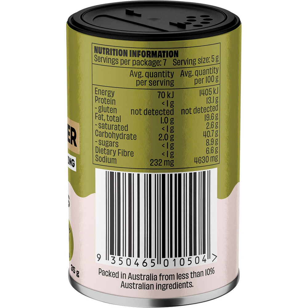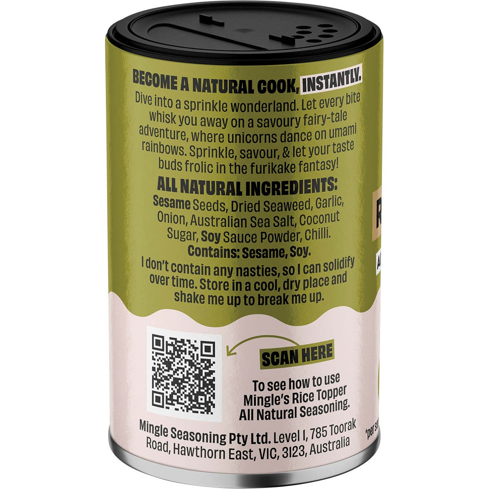 Sesame Seeds, Dried Seaweed, Garlic, Onion, Australian Sea Salt, Coconut Sugar, Soy Sauce Powder, Chilli. Contains: Sesame, Soy.
