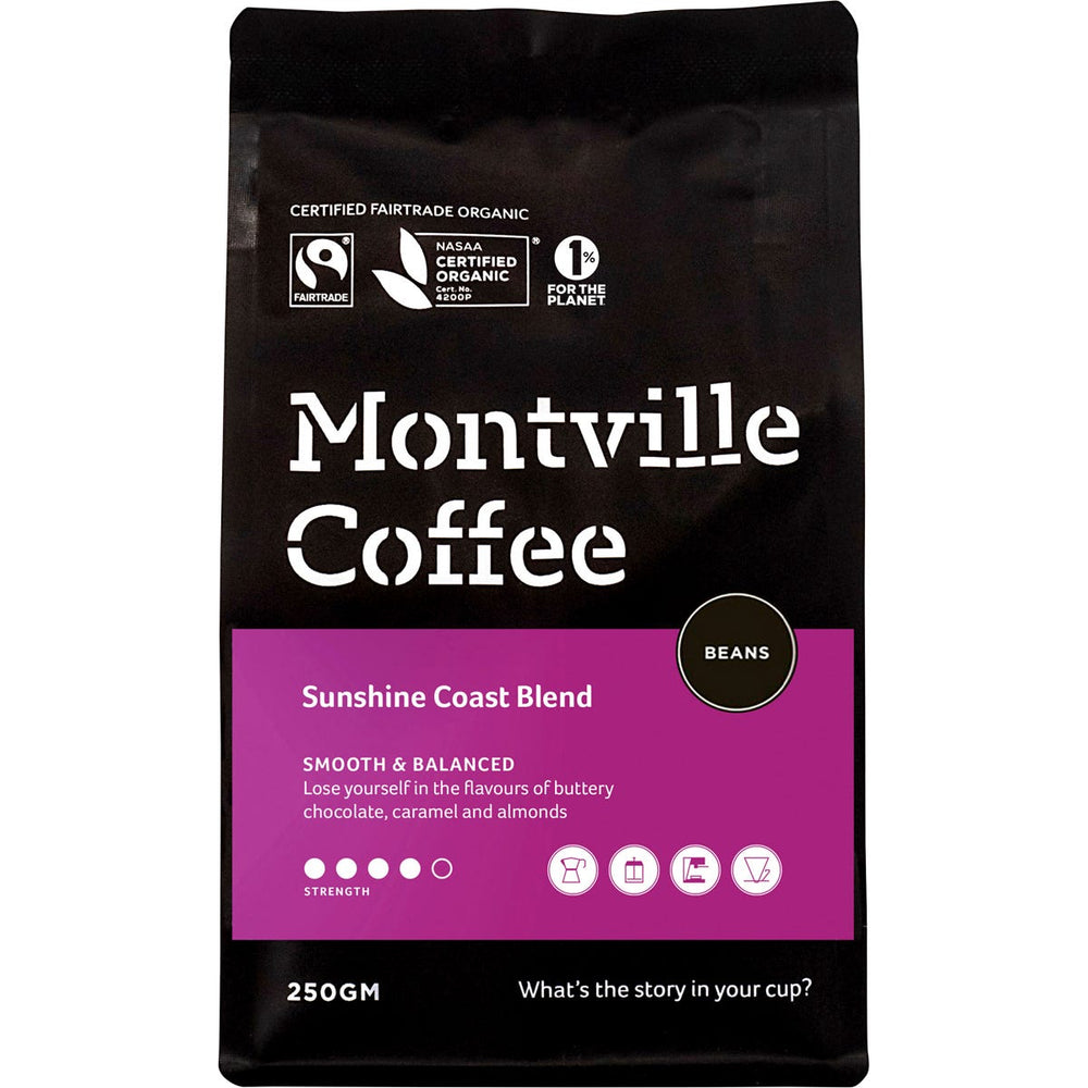 Montville Coffee Coffee Beans Sunshine Coast Blend 250g Ingredients: Certified Organic Coffee Beans from PNG, Nicaragua, Mexico and Columbia. This product is usually dispatched or made available for collection in 2-3 business days