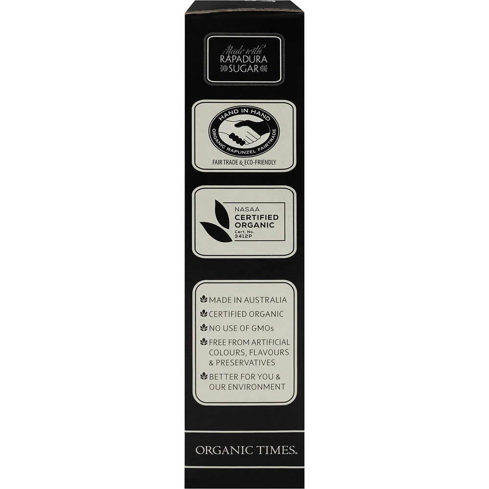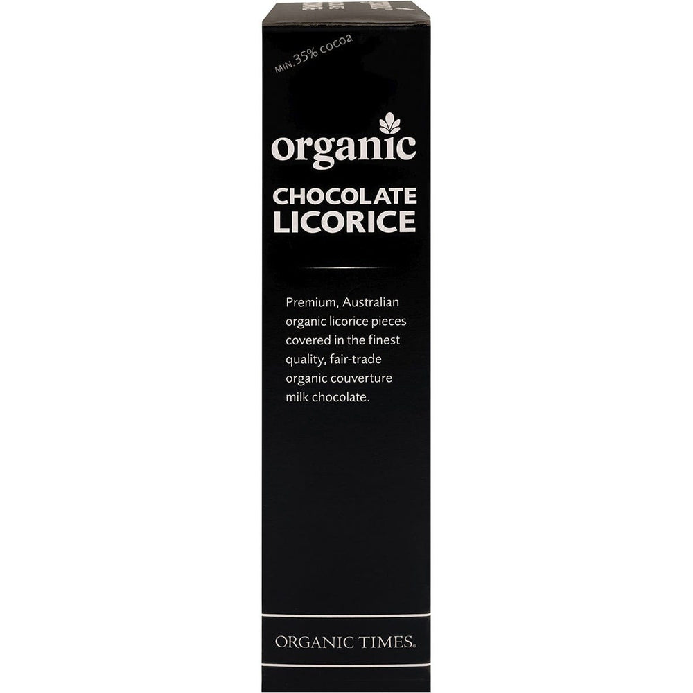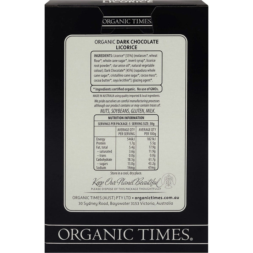 Organic Times Dark Chocolate Licorice 150g Ingredients: Licorice* (55%) (Molasses*, Wheat Flour*, Whole Cane Sugar, Invert Syrup, Licorice Root Powder* (0.6%), Star Anise Oil*, Natural Vegetable Colour), Dark Chocolate* (45%) (Rapadura Whole Cane Sugar*, Cristallino Cane Sugar*, Cocoa Mass*, Cocoa Butter*, Soya Lecithin*), Glazing Agent*. *Ingredients Certified Organic This product is usually dispatched or made available for collection in 2-3 business days