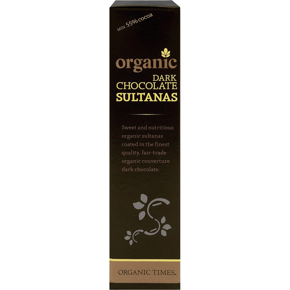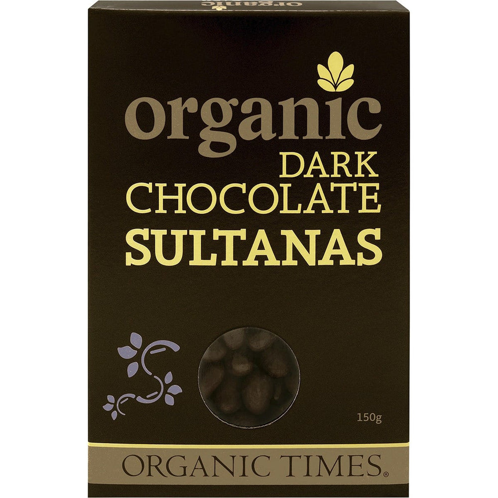 Organic Times Dark Chocolate Sultanas 150g Ingredients: *Dark Chocolate (60%) (*Cocoa Mass, *Rapadura Whole Cane Sugar, *Cristallino Cane Sugar, *Cocoa Butter, *Soya Lecithin), *Sultanas (40%), *Glazing Agent. *Ingredients Certified Organic This product is usually dispatched or made available for collection in 2-3 business days