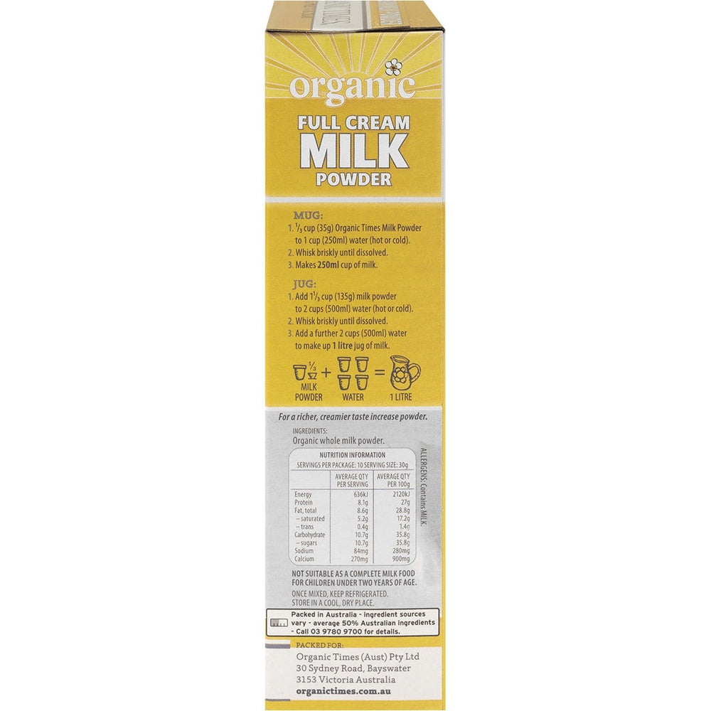 Organic Times Milk Powder Full Cream 300g Ingredients: Organic Whole Milk Powder. This product is usually dispatched or made available for collection in 2-3 business days