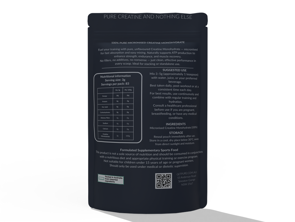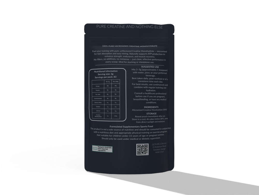 Get Pure Creatine Monohydrate delivers strength, power, and recovery. Our micronised powder is pure, unflavoured, and easy to mix into any drink. Nothing added, nothing taken away—just pure creatine.