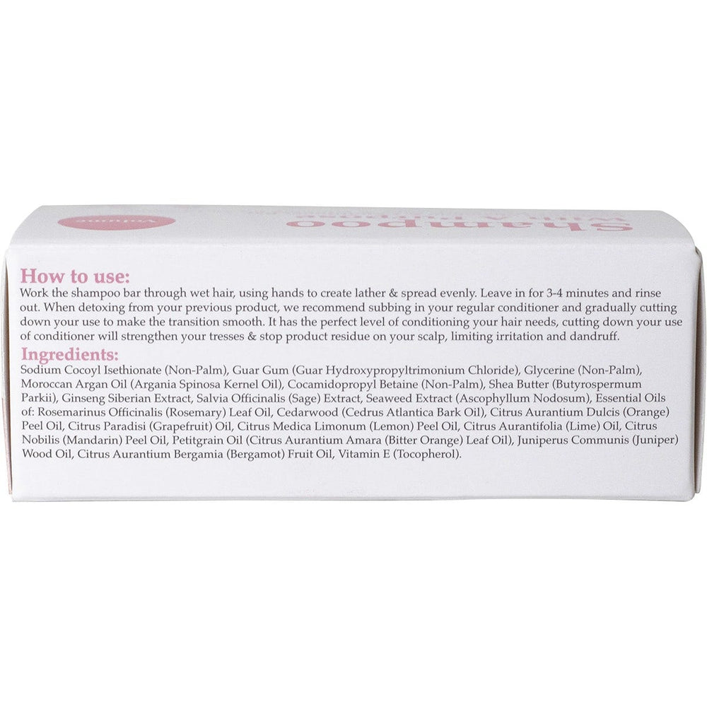Shampoo With A Purpose Shampoo & Conditioner Bar Volume 135g Ingredients: Sodium Cocoyl Isethionate, Guar Gum (Guar Hydroxypropyl Trimonium Chloride), Plant Origin Glycerine (Glycerin), Moroccan Argan Oil (Argania Spinosa Kernel Oil), Sodium Laurel Sulphoacetate, Shea Butter (Butyrospermum Parkii), Panax Ginseng Root Extract, Salvia Officinalis (Sage) Extract, Seaweed Extract (Ascophyllum Nodosum), Essential Oils of: Juniperus Communis (Juniper) Wood Oil, Rosemary - (Rosmarinus Officinalis (Rosemary) Leaf Oil), Cedarwood - Cedrus Atlantica Bark Oil, Orange Oil - Citrus Aurantium Dulcis (Orange) Peel Oil, Pink Grapefruit Oil - Citrus Paradisi (Grapefruit) Oil, Lemon Oil - Citrus Medica Limonum (Lemon) Peel Oil, Lime Oil - Citrus Aurantifolia (Lime ) Oil, Mandarin Oil - Citrus Nobilis(Mandarin Orange) Peel Oil, Petitgrain OIl - Citrus Aurantium Amara (Bitter Orange) Leaf Oil, Bergamot - Citrus Aurantium Bergamia (Bergamot) Fruit Oil. This product is usually dispatched or made available for collection in 2-3 business days