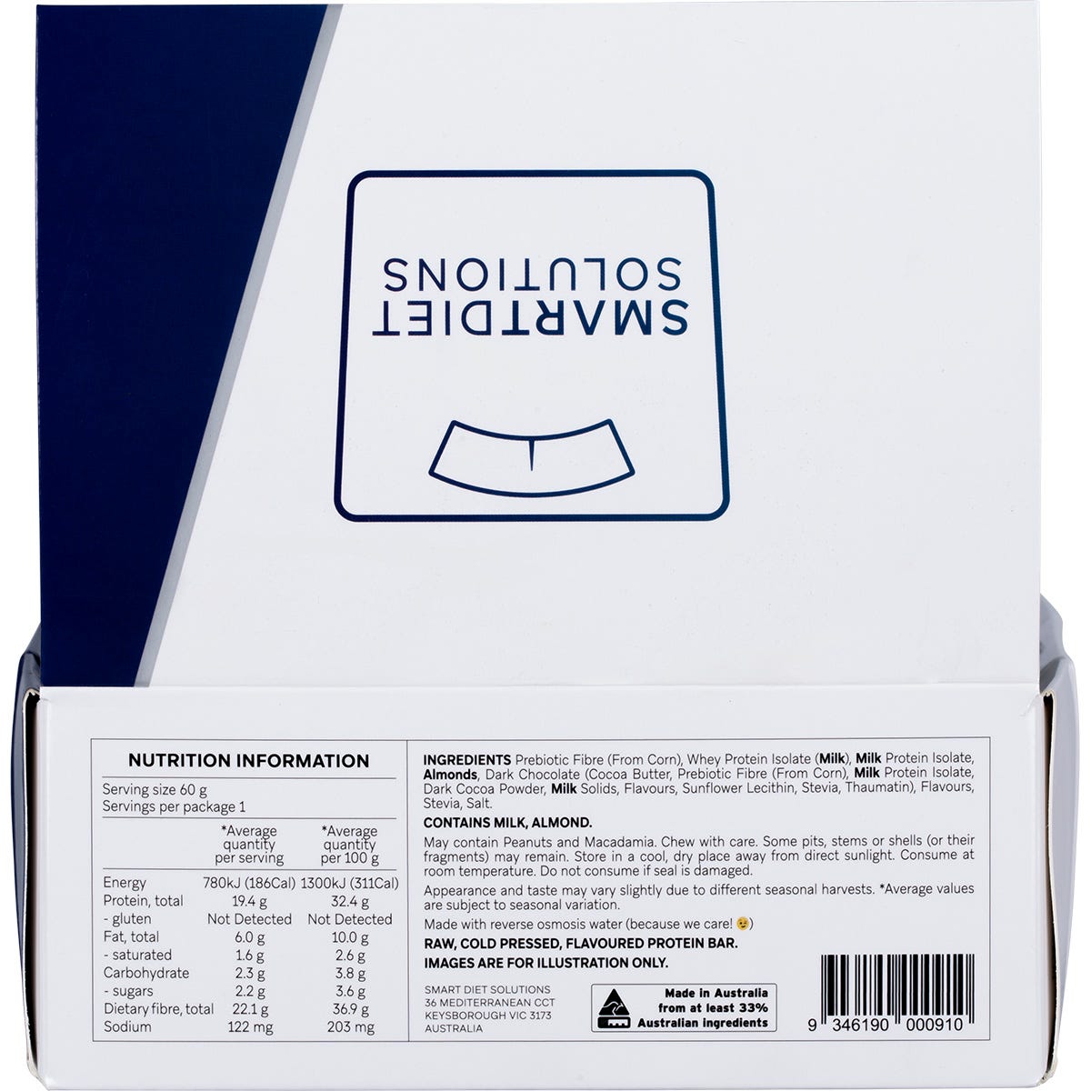 Protein Blend (38%) [Whey Protein Isolate (from Milk), Milk Protein Isolate], Prebiotic Fibre (Corn), Almonds, Protein Dark Chocolate (5%) (from Milk), Flavours, Sweetener (Steviol Glycosides), Salt.
