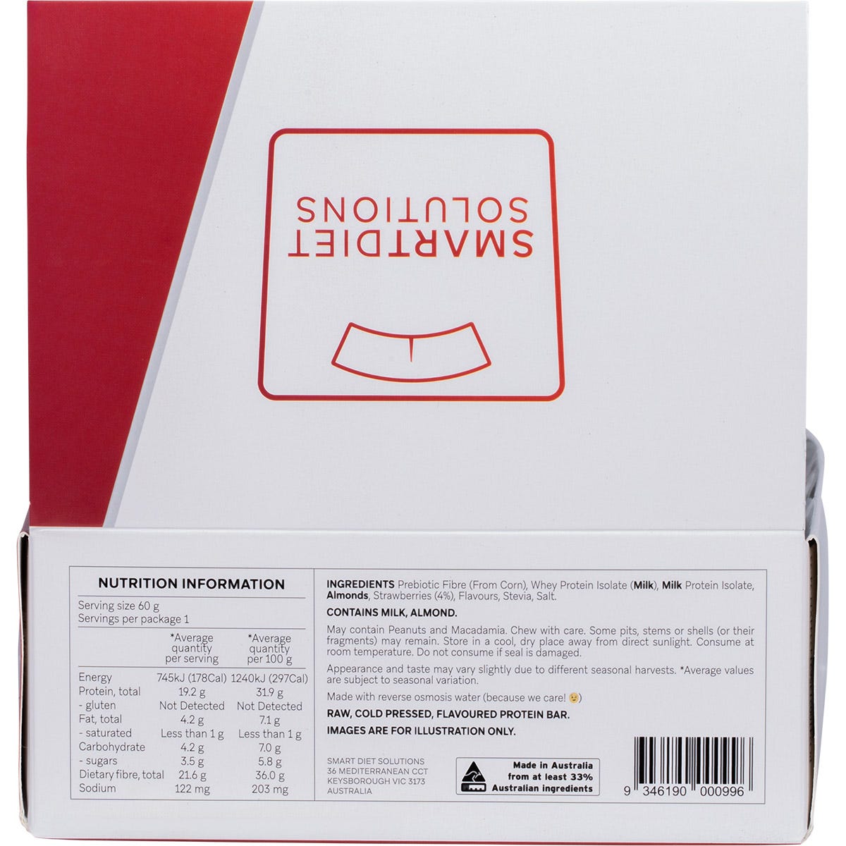 Prebiotic Fibre (From Corn), Whey Protein Isolate (Milk), Milk Protein Isolate, Almonds, Strawberries (4%), Flavours, Stevia, Salt.