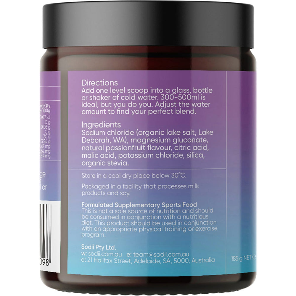 Sodium Chloride (Organic Lake Salt, Lake Deborah, WA), Magnesium Gluconate, Natural Passionfruit Flavour, Malic Acid, Citric Acid, Potassium Chloride, Silica, Organic Stevia.