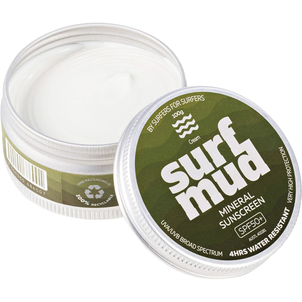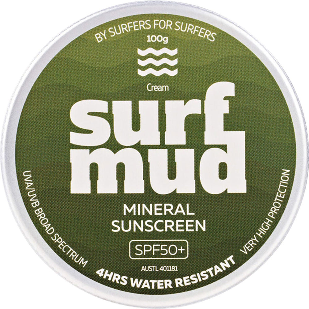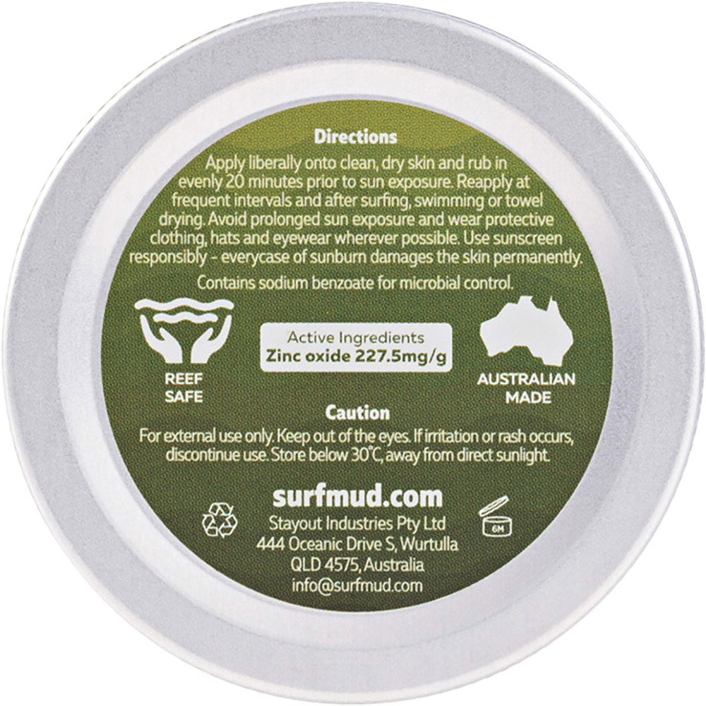 Surfmud Mineral Sunscreen SPF 50+ Tin 100g Ingredients: Active Ingredient: Zinc Oxide 227.5mg/g. Inactive Ingredients: 1,3-Butylene Glycol, Coco-Octanoate/Decanoate, D-Alpha-Tocopheryl Acetate, Dimeticone 350, Disodium Edetate, Gluconolactone, Glycerol, Glyceryl Monooleate, Isostearic Acid, Medium Chain Triglycerides, Octyl Palmitate, Peg-30 Dipolyhydroxystearate, Polyethylene, Polyglyceryl-3 Polyricinoleate, Purified Water, Sodium Benzoate, Sodium Chloride, White Beeswax, Xanthan Gum. This product is usually dispatched or made available for collection in 2-3 business days