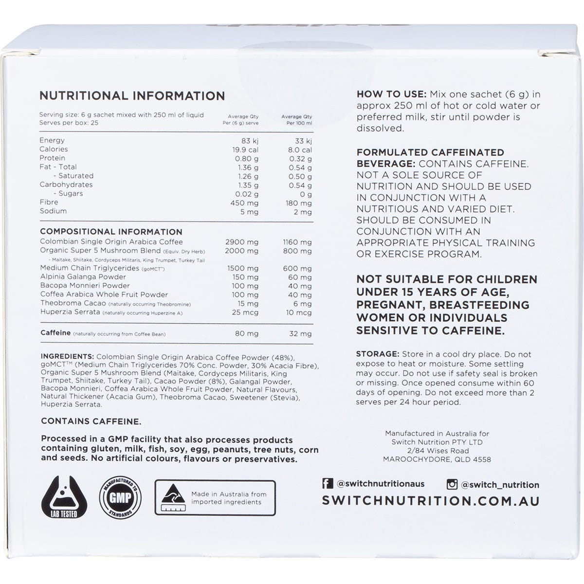 Colombian Single Origin Arabica Coffee Powder (48%), goMCT™ (Medium Chain Triglycerides 70% Conc. Powder, 30% Acacia Fibre), Organic Super 5 Mushroom Blend (Maitake, Cordyceps Militaris, King Trumpet, Shiitake, Turkey Tail), Cocao Powder (8%), Galangal Powder, Bacopa Monnieri, Coffea Arabica Whole Fruit Powder, Natural Flavours, Natural Thickener (Acacia Gum),Theobroma Cacao, Sweetener (Stevia), Huperzia Serrata.