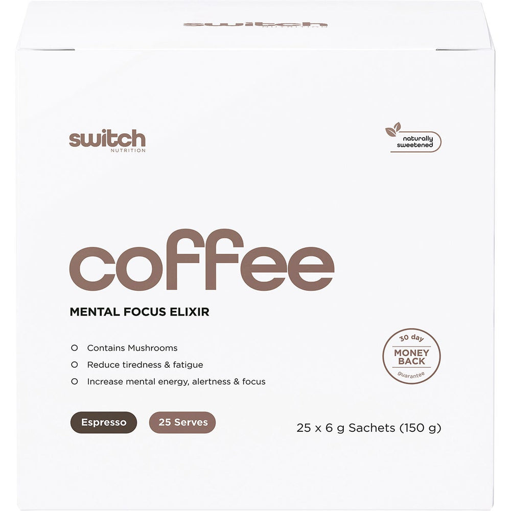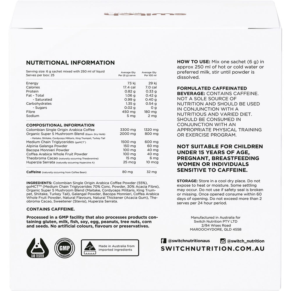 Switch Nutrition Coffee Mental Focus Elixir Espresso Sweetened 25pk Ingredients: Colombian Single Origin Arabica Coffee Powder (55%), goMCT™ (Medium Chain Triglycerides 70% Conc. Powder, 30% Acacia Fibre), Organic Super 5 Mushroom Blend (Maitake, Cordyceps Militaris, King Trumpet, Shiitake, Turkey Tail), Galangal Powder, Bacopa Monnieri, Coffea Arabica Whole Fruit Powder, Natural Flavours, Natural Thickener (Acacia Gum), Theobroma Cacao, Sweetener (Stevia), Huperzia Serrata. This product is usually dispatched or made available for collection in 2-3 business days