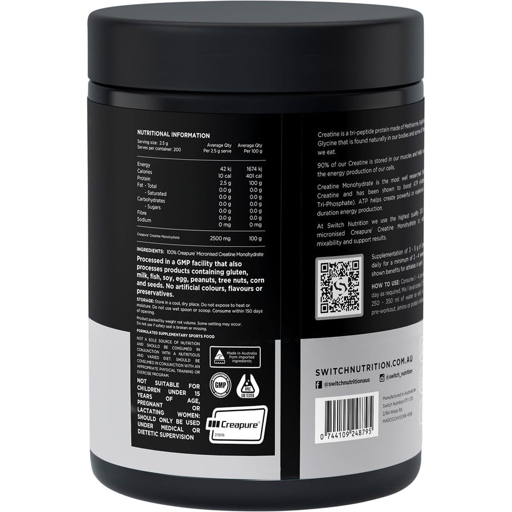 Switch Nutrition Creatine 100% Pure Monohydrate Unflavoured 500g Ingredients: 100% Micronised Creatine Monohydrate. This product is usually dispatched or made available for collection in 2-3 business days