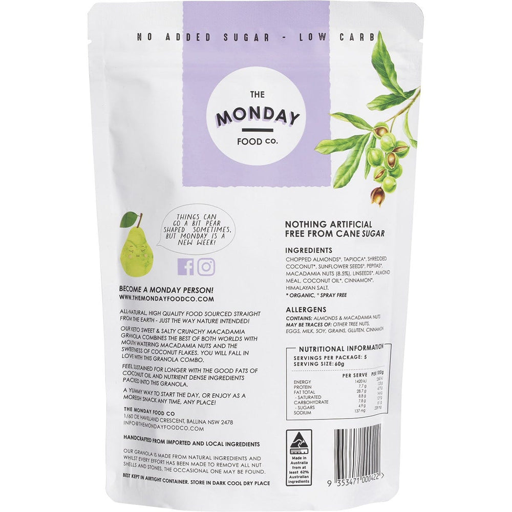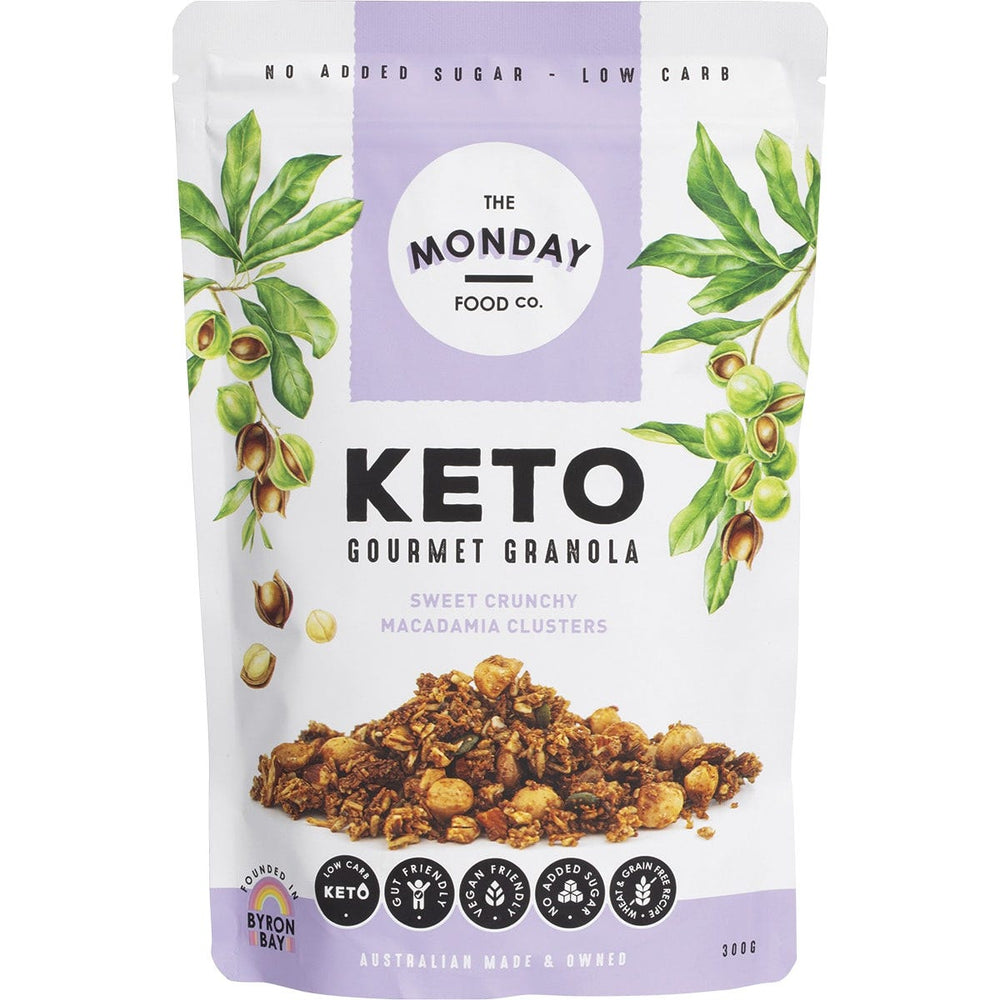 The Monday Food Co. Keto Gourmet Granola Sweet Crunchy Macadamia Clusters 300g Ingredients: Chopped & Whole Almonds, Tapioca, Shredded Coconut, Sunflower Seeds, Pepitas, Macadamia Nuts (8.5%), Linseeds, Almond Meal, Coconut Oil, Cinnamon, Himalayan Salt. This product is usually dispatched or made available for collection in 2-3 business days