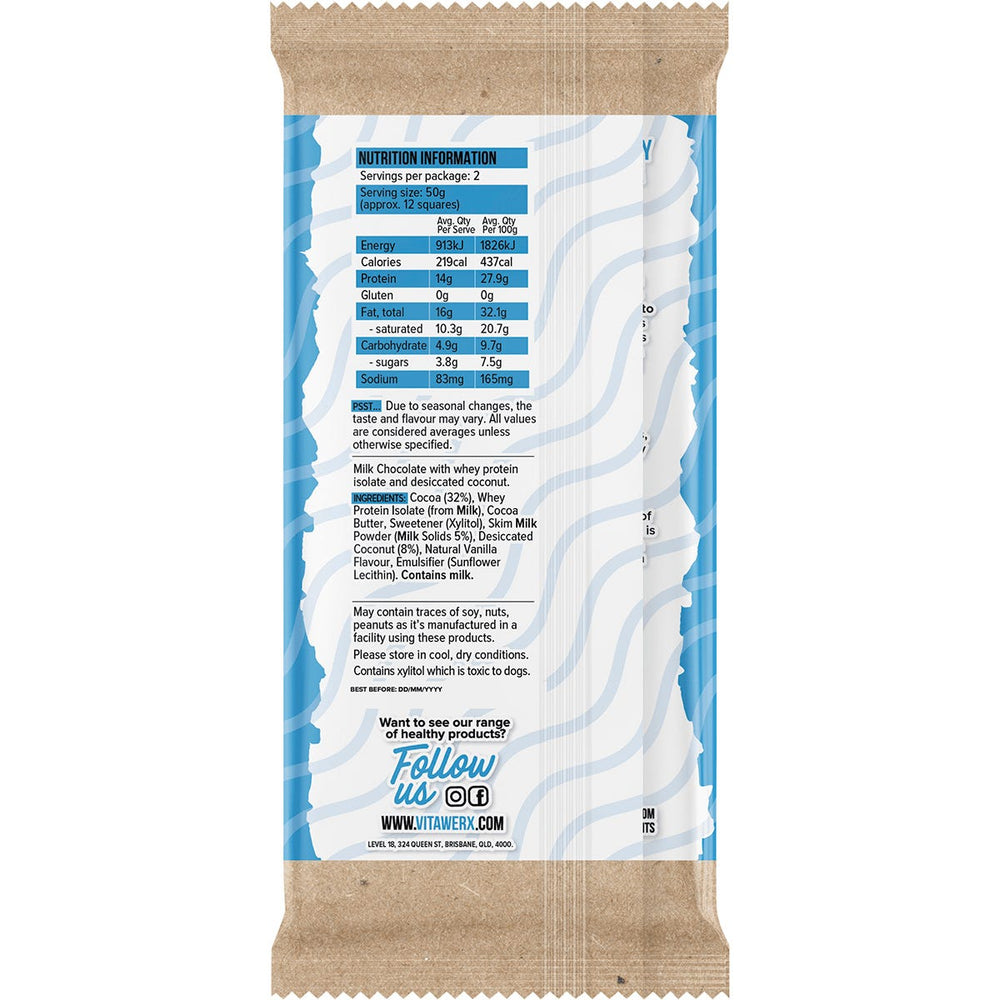 Vitawerx Protein Milk Chocolate Bar Coconut Rough 12x100g Ingredients: Cocoa (32%), Whey Protein Isolate (from Milk), Cocoa Butter, Sweetener (Xylitol), Skim Milk Powder (Milk Solids 5%), Desiccated Coconut (8%), Natural Vanilla Flavour, Emulsifier (Sunflower Lecithin). Contains milk. This product is usually dispatched or made available for collection in 2-3 business days
