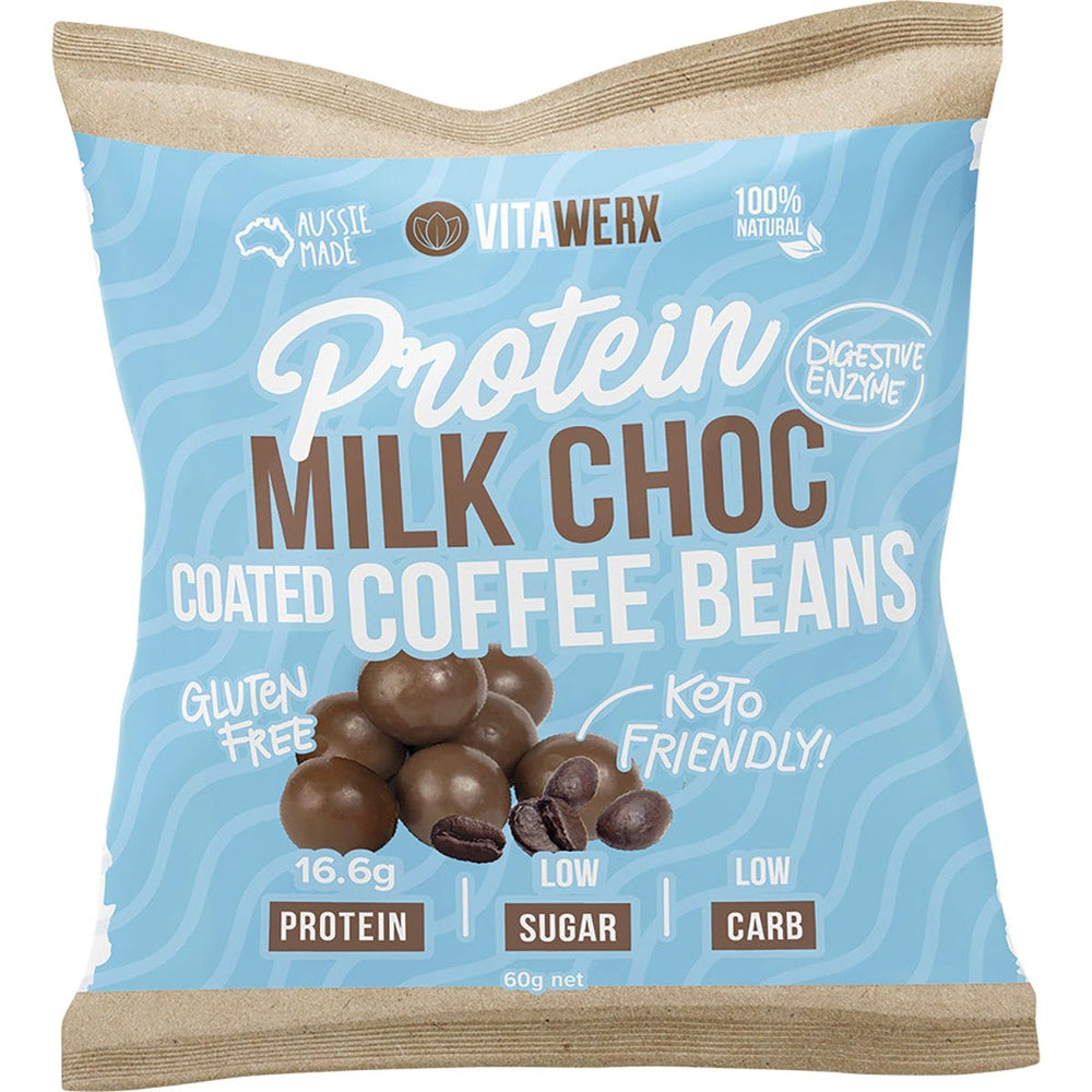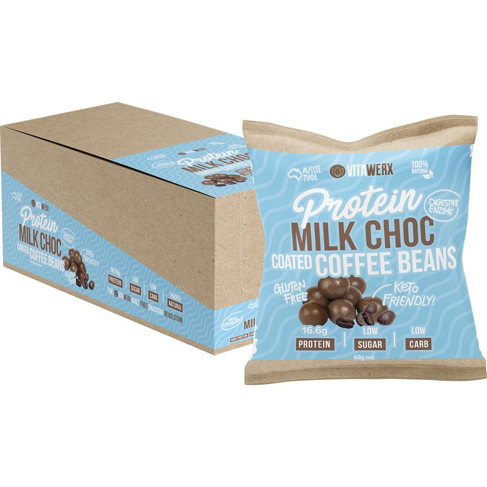 Vitawerx Protein Milk Chocolate Coated Coffee Beans 10x60g Ingredients: Roasted Coffee Beans, Cocoa (32%), Whey Protein Isolate, Cocoa Butter, Birch Natural Sweetener (967), Skim Milk Powder, Milk Solids (5%), Vanilla Extract, Digestive Enzyme Zingiberaceae (Ginger), Emulsifier (322, 476). This product is usually dispatched or made available for collection in 2-3 business days