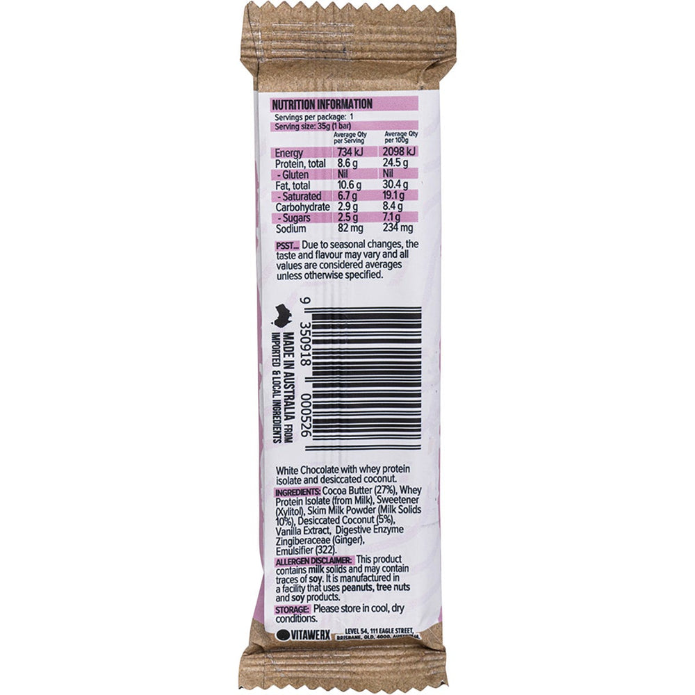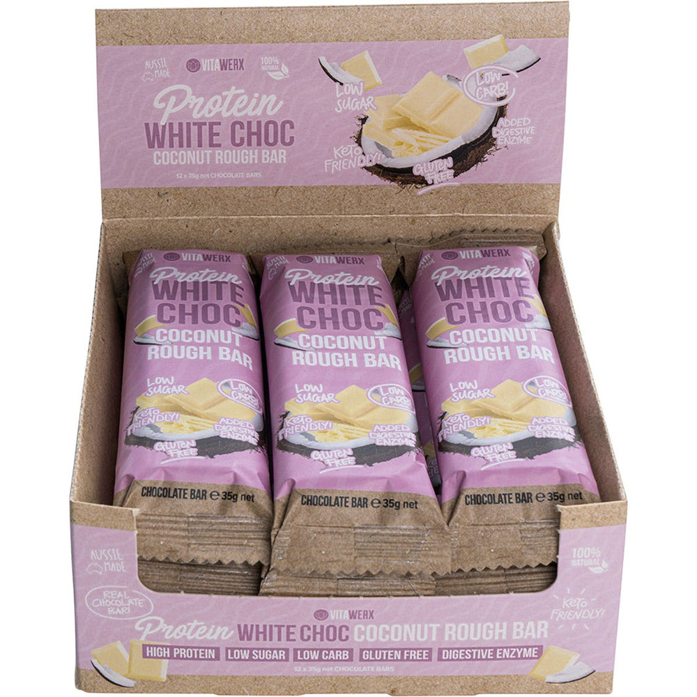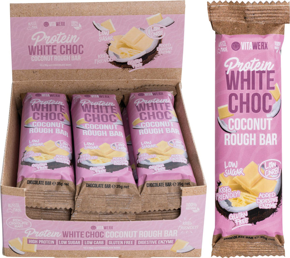 Vitawerx Protein White Chocolate Bar Coconut Rough 12x35g Ingredients: Cocoa Butter (Cocoa Solids 27%), Whey Protein Isolate, Sweetener (xylitol), Skim Milk Powder (Milk Solids 10%), Desiccated Coconut (5%), Vanilla Extract, Digestive Enzyme Zingiberoceoe (Ginger), Emulsifier (322, 476). This product is usually dispatched or made available for collection in 2-3 business days