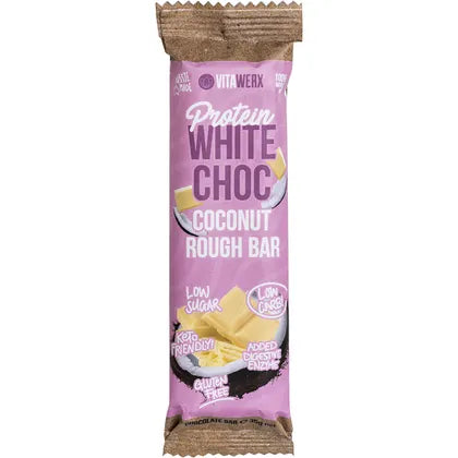 VITAWERX Protein White Chocolate Bar Coconut Rough - 35g Cocoa Butter (Cocoa Solids 27%), Whey Protein Isolate, Sweetener (xylitol), Skim Milk Powder (Milk Solids 10%), Desiccated Coconut (5%), Vanilla Extract, Digestive Enzyme Zingiberoceoe (Ginger), Emulsifier (322, 476).