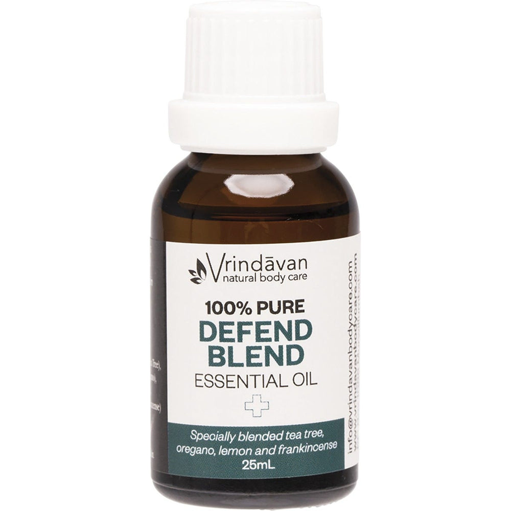 Vrindavan Essential Oil 100% Defend Blend 25ml Ingredients: Tea Tree, Oregano, Lemon, Frankincense Essential Oils This product is usually dispatched or made available for collection in 2-3 business days