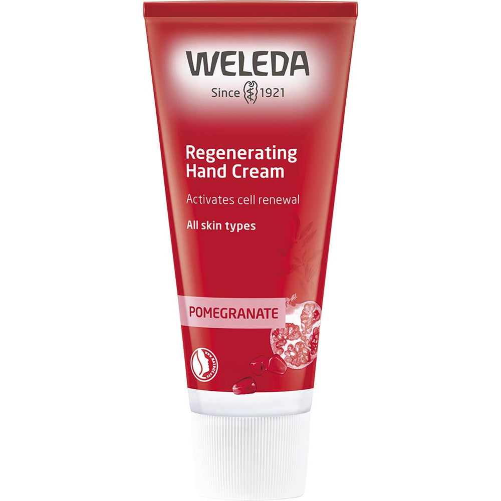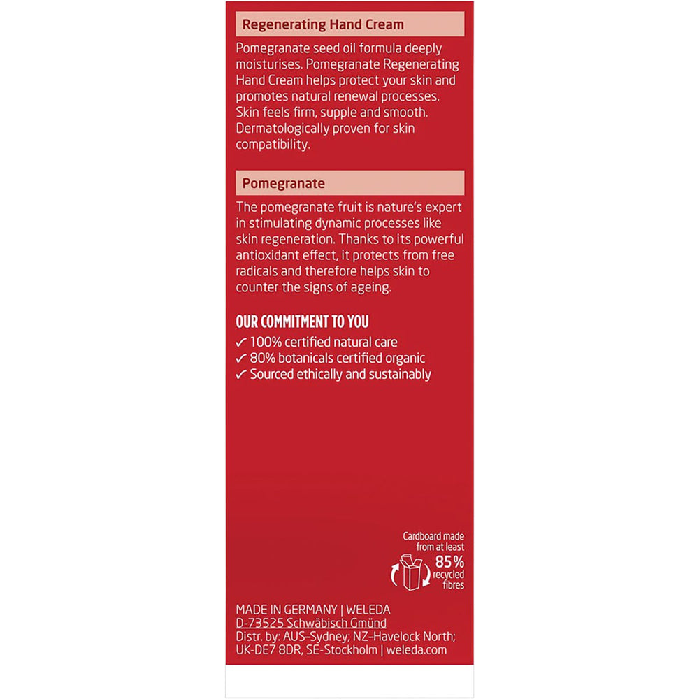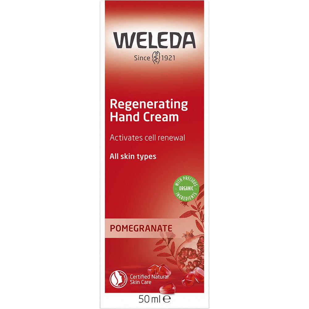Weleda Hand Cream Pomegranate 50ml Ingredients: Water (Aqua), Sesamum Indicum (Sesame) Seed Oil, Glycerin, Alcohol, Glyceryl Stearate SE, Butyrospermum Parkii (Shea) Butter, Olea Europaea (Olive) Oil Unsaponifiables, Helianthus Annuus (Sunflower) Seed Oil, Stearic Acid, Punica Granatum Seed Oil, Panicum Miliaceum (Millet) Seed Extract, Ruscus Aculeatus Root Extract, Helianthus Annuus (Sunflower) Petal Extract, Persea Gratissima Oil Unsaponifiables, Xanthan Gum, Fragrance (Parfum)*, Limonene*, Linalool*, Citronellol*, Benzyl Benzoate*, Geraniol*, Citral*, Eugenol*, Coumarin*. *From Natural Essential Oils This product is usually dispatched or made available for collection in 2-3 business days