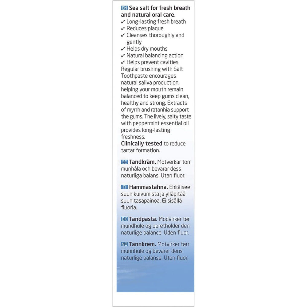 Weleda Toothpaste Salt Salty Peppermint Flavour 75ml Ingredients: Sodium Bicarbonate, Water (Aqua), Glycerin, Silica, Mentha Piperita (Peppermint) Oil, Prunus Spinosa Fruit Juice', Sodium Chloride, Commiphora Myrrha Resin Extract, Krameria Triandra Root Extract, Aesculus Hippocastanum (Horse Chestnut) Bark Extract, Arum Maculatum Root Extract**, Cyamopsis Tetragonoloba (Guar) Gum*, Alcohol, Simmondsia Chinensis Seed Oil', Esculin, Lactose, Flavor (Aroma)*, Limonene*, Linalool*. *From Natural Essential Oils **In Highly Diluted Form 'Organic Ingredient This product is usually dispatched or made available for collection in 2-3 business days