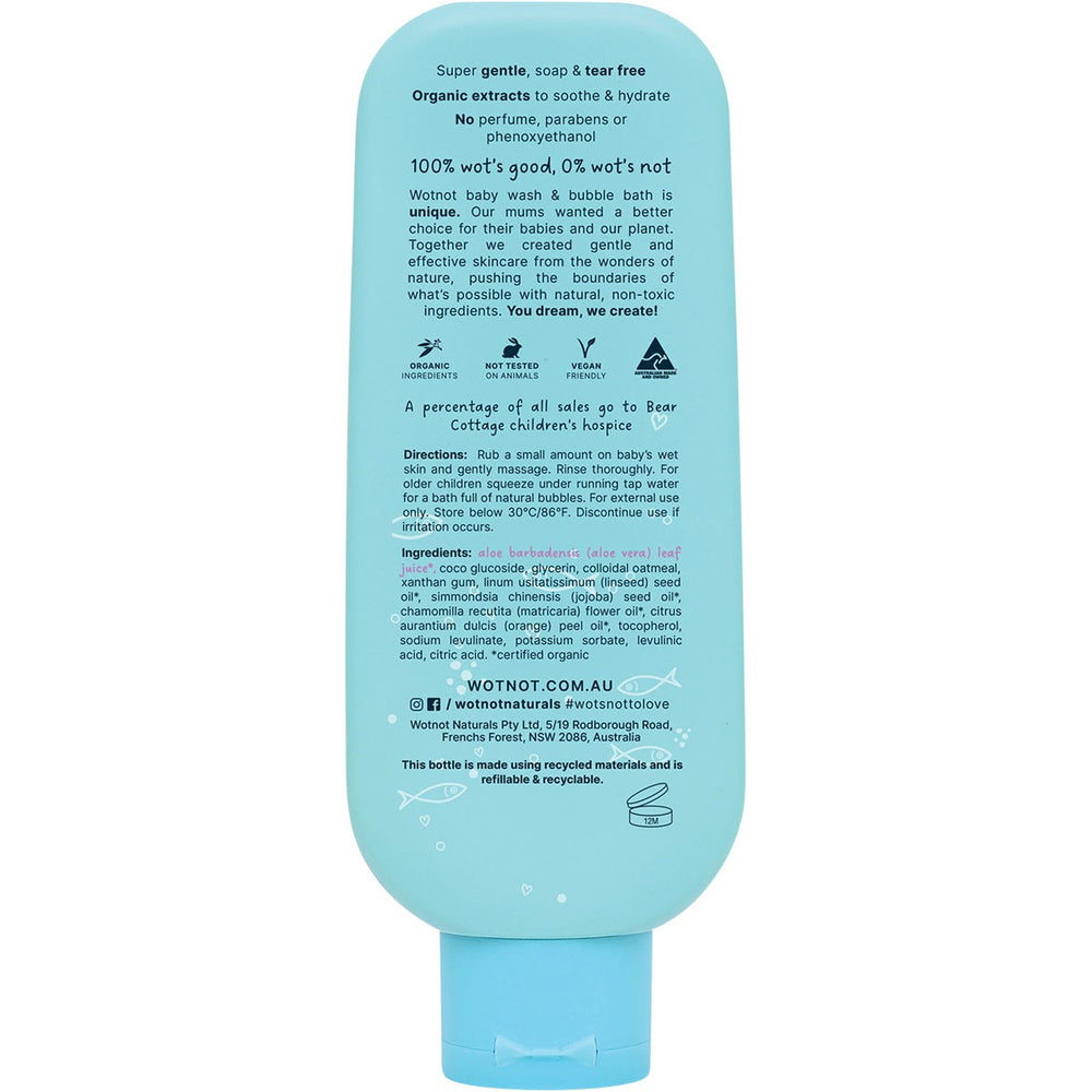 Wotnot Baby Wash & Bubble Bath Suitable For Sensitive Skin 250ml Ingredients: Aloe Barbadensis (Aloe Vera) Leaf Juice*, Coco Glucoside, Glycerin, Colloidal Oatmeal, Xanthan Gum, Linum Usitatissimum (Linseed) Oil, Simmondsia Chinensis (Jojoba) Seed Oil*, Chamomilla Recutita (Matricaria) Flower Oil*, Citrus Aurantium Dulcis (Orange) Peel Oil*, Tocopherol, Sodium Levulinate, Potassium Sorbate, Levulinic Acid, Citric Acid *Certified Organic. This product is usually dispatched or made available for collection in 2-3 business days