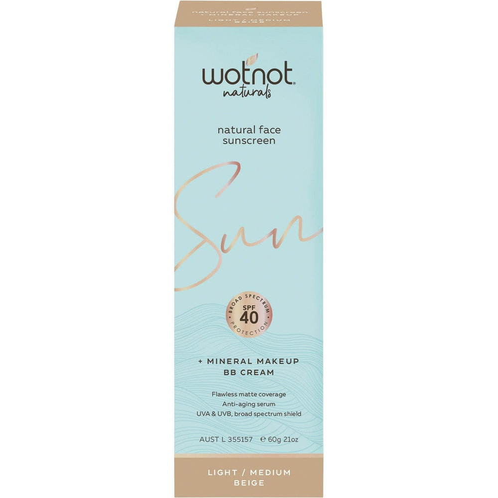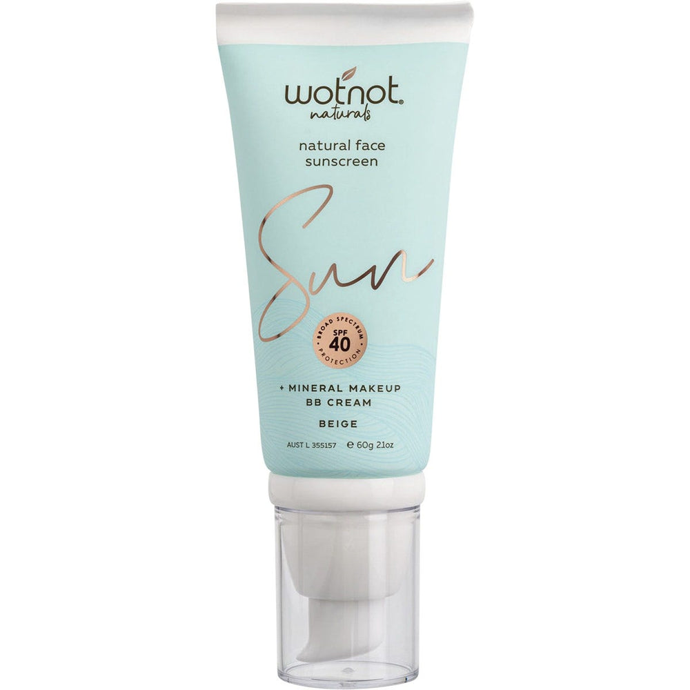 Wotnot Natural Face Sunscreen 40 SPF Beige BB Cream 60g Ingredients: Active Ingredient: Zinc Oxide 250Mg/G.Preservative: Phenethyl Alcohol.Other Ingredients: Purified Water, Coco-Caprylate, Diisopropyl Adipate, Galactoarabinan, Titanium Dioxide & Silica & Aluminum Hydroxide, Polyglyceryl-3 Polyricinoleate, Cetyl Palmitate & Sorbitan Palmitate & Sorbitan Olivate, Simmondsia Chinensis (Jojoba) Seed Oil, Polyglyceryl-3 Diisostearate, Hydrolyzed Jojoba Esters, Vp/Eicosene Copolymer, Silica Dimethyl Silylate, Glycerine, Iron Oxides, Aloe Barbadensis (Aloe Vera) Leaf Juice, Camellia Oleifera (Camellia) Oil, Polyhydroxystearic Acid, Camellia Sinensis (Green Tea) Extract, Tocopherol (Vitamin E), Xanthan Gum, Magnesium Sulfate, Caprylyl Glycol, Glyceryl Caprylate. This product is usually dispatched or made available for collection in 2-3 business days