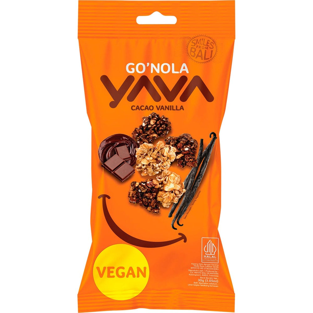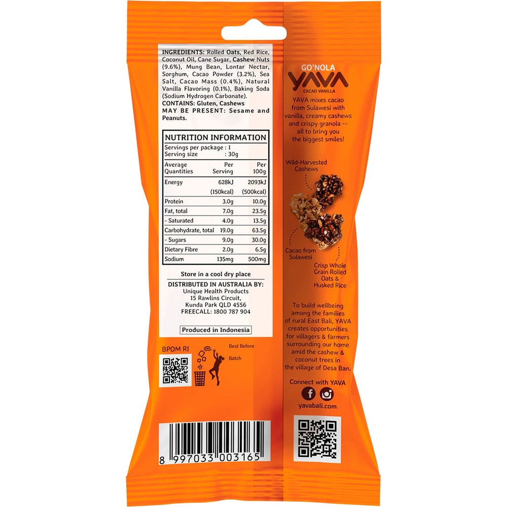YAVA Go'Nola Cacao Vanilla 12x30g Ingredients: Rolled Oats, Red Rice, Coconut Oil, Cane Sugar, Cashew Nuts (9.6%), Mung Bean, Lontar Nectar, Sorghum, Cacao Powder (3.2%), Sea Salt, Cacao Mass (0.4%), Natural Vanilla Flavouring (0.1%), Baking Soda (Sodium Hydrogen Carbonate). This product is usually dispatched or made available for collection in 2-3 business days
