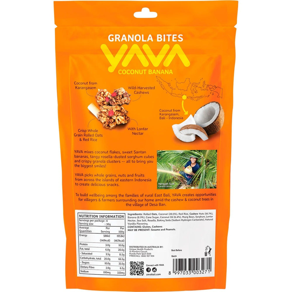 YAVA Granola Bites Coconut Banana 125g Ingredients: Rolled Oats, Coconut (20.5%), Red Rice, Cashew Nuts (10.7%), Banana (8.9%), Cane Sugar, Coconut Oil (6.4%), Mung Bean, Sorghum, Lontar Nectar, Sea Salt, Rosella, Baking Soda (Sodium Hydrogen Carbonate), Natural Vanilla Flavouring. This product is usually dispatched or made available for collection in 2-3 business days