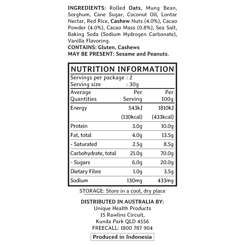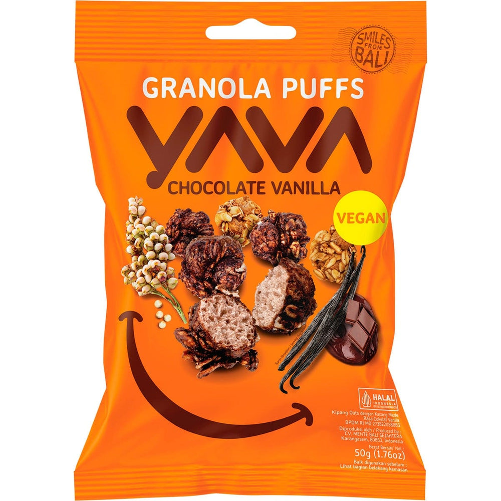 YAVA Granola Puffs Chocolate Vanilla 50g Ingredients: Rolled Oats, Mung Bean, Sorghum, Cane Sugar, Coconut Oil, Lontar Nectar, Red Rice, Cashew Nuts (4.0%), Cacao Powder (4.0%), Cacao Mass (0.8%), Sea Salt, Baking Soda (Sodium Hydrogen Carbonate), Vanilla Flavouring. This product is usually dispatched or made available for collection in 2-3 business days