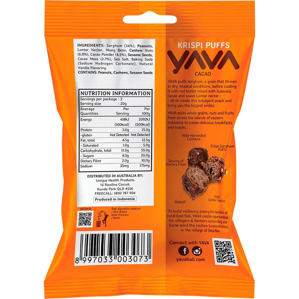 YAVA Krispi Puffs Cacao 45g Ingredients: Sorghum (34%), Peanuts, Lontar Nectar, Mung Bean, Cashew Nuts (6.8%), Cacao Powder (4.5%), Sesame Seeds, Cacao Mass (2.7%), Sea Salt, Baking Soda (Sodium Hydrogen Carbonate), Natural Vanilla Flavouring. This product is usually dispatched or made available for collection in 2-3 business days